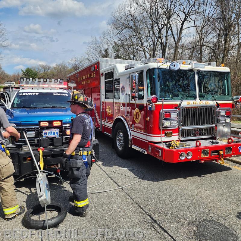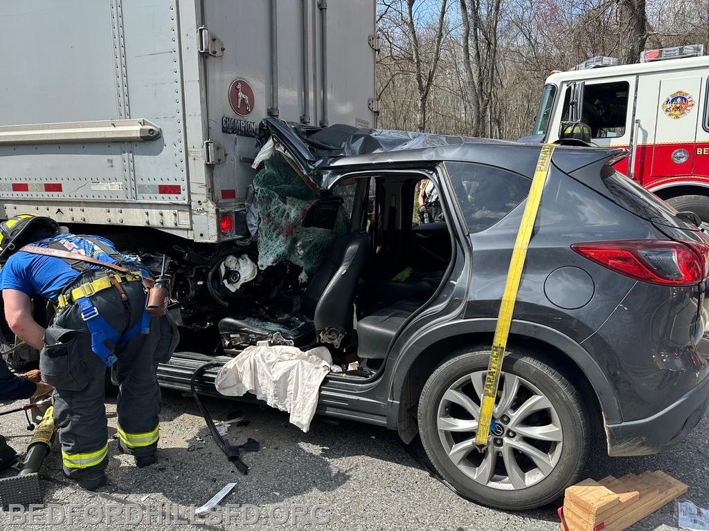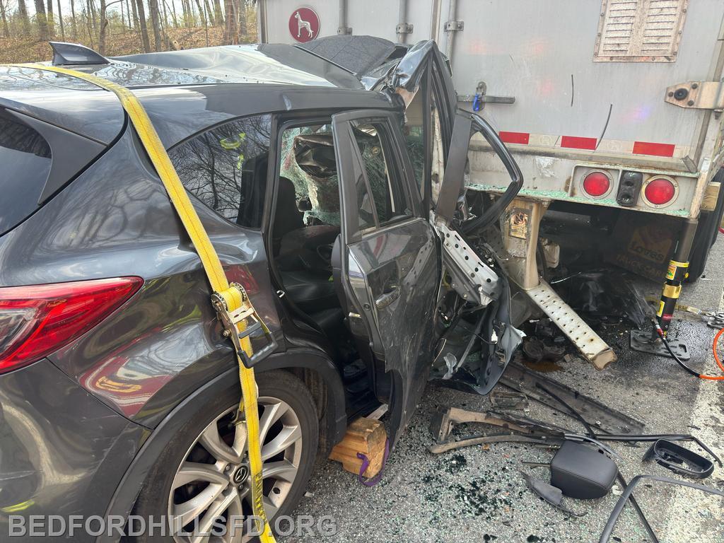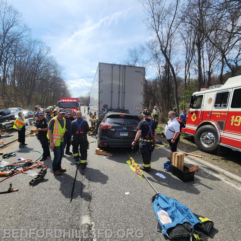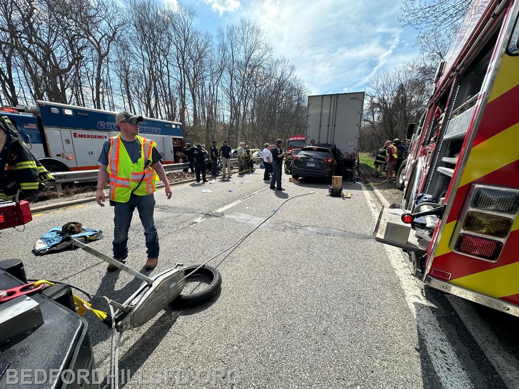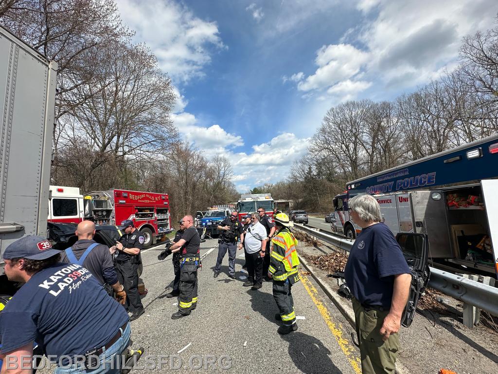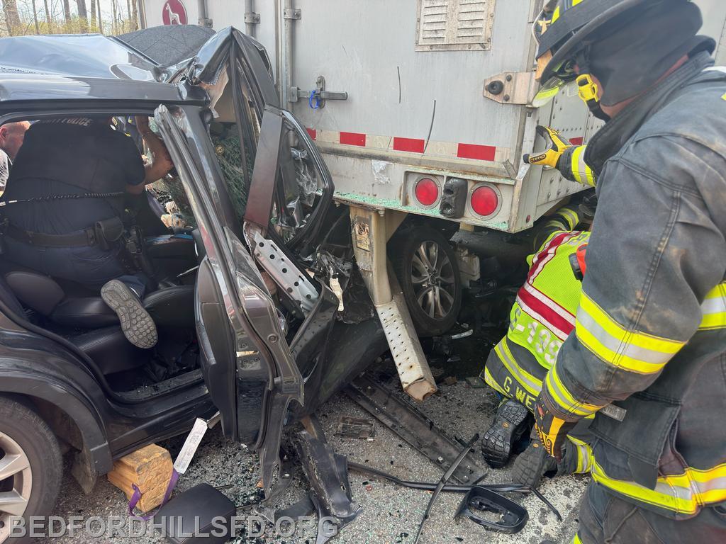 At approximately 1:47pm. on Tuesday, April 14, 2026, the Bedford Hills Fire Department was dispatched to a reported motor vehicle accident with entrapment on the Saw Mill River Parkway. Chief Patierno (Car 2031) arrived first on scene and determined the crash had occurred within the Katonah Fire District, between the Route 117 Bypass exit and the Harris Road exit. Chief Patierno advised 60 Control that the victim was heavily entrapped after an SUV had underridden a tractor-trailer. He immediately requested mutual aid from the Katonah Fire Department.