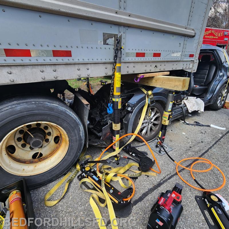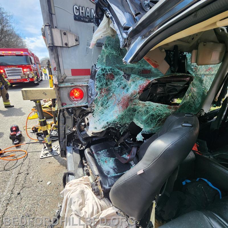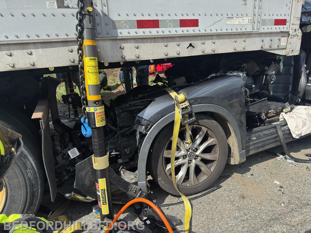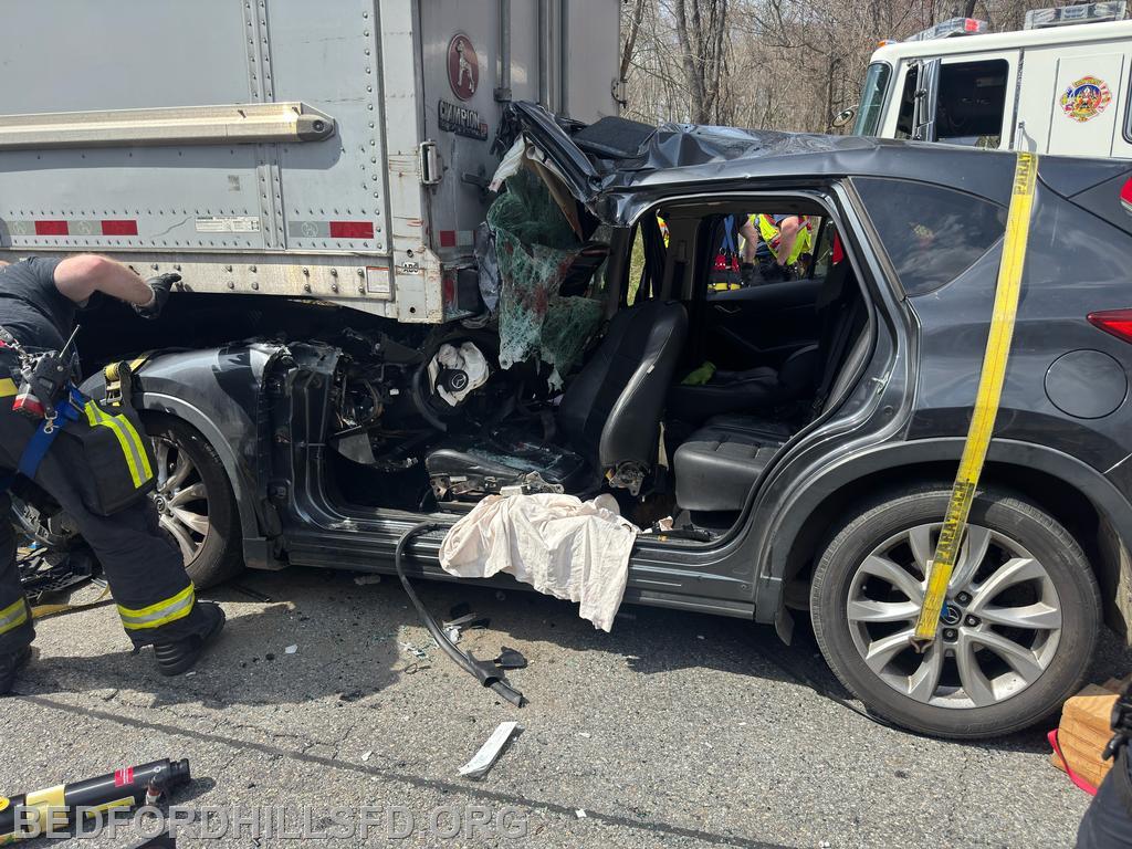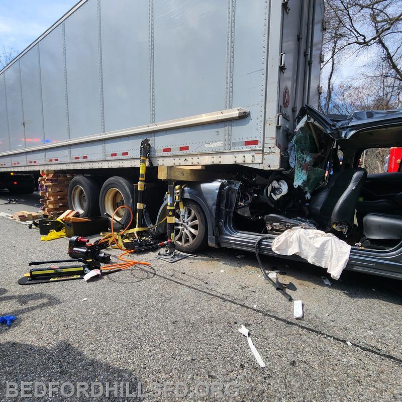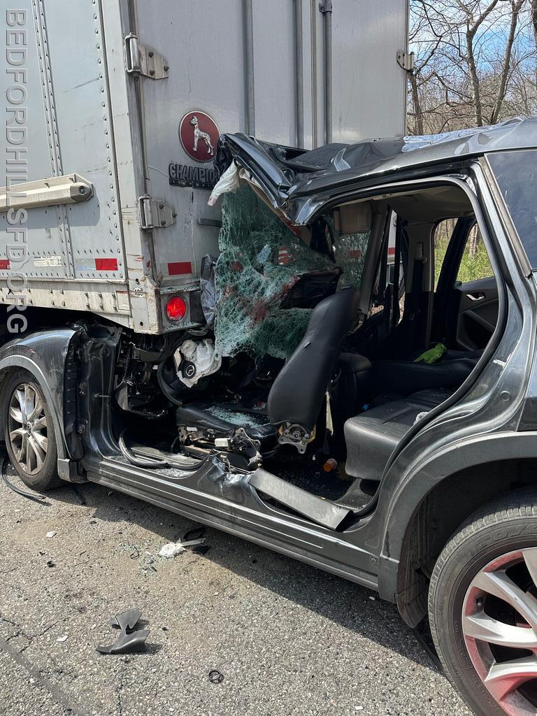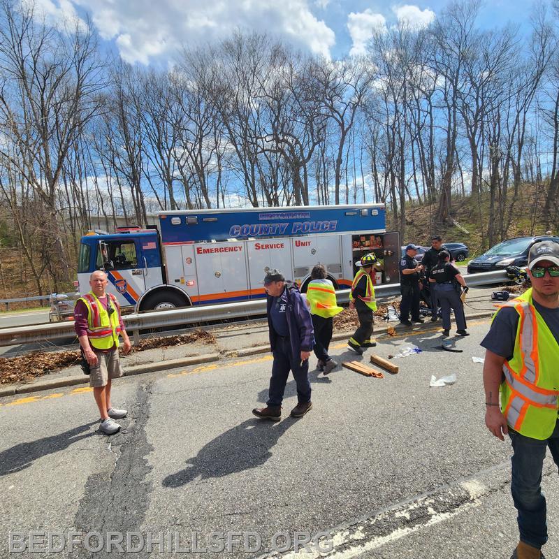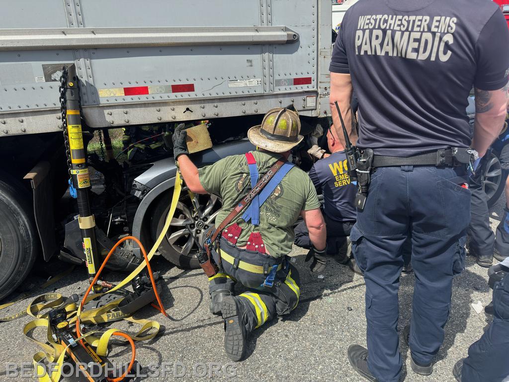 At approximately 1:47pm. on Tuesday, April 14, 2026, the Bedford Hills Fire Department was dispatched to a reported motor vehicle accident with entrapment on the Saw Mill River Parkway. Chief Patierno (Car 2031) arrived first on scene and determined the crash had occurred within the Katonah Fire District, between the Route 117 Bypass exit and the Harris Road exit. Chief Patierno advised 60 Control that the victim was heavily entrapped after an SUV had underridden a tractor-trailer. He immediately requested mutual aid from the Katonah Fire Department.