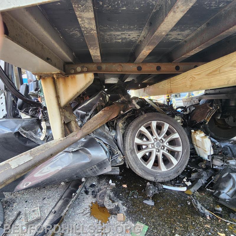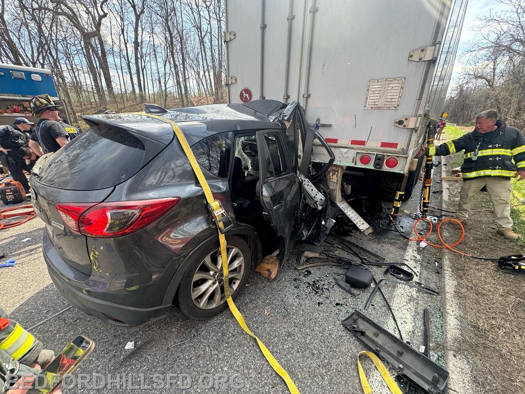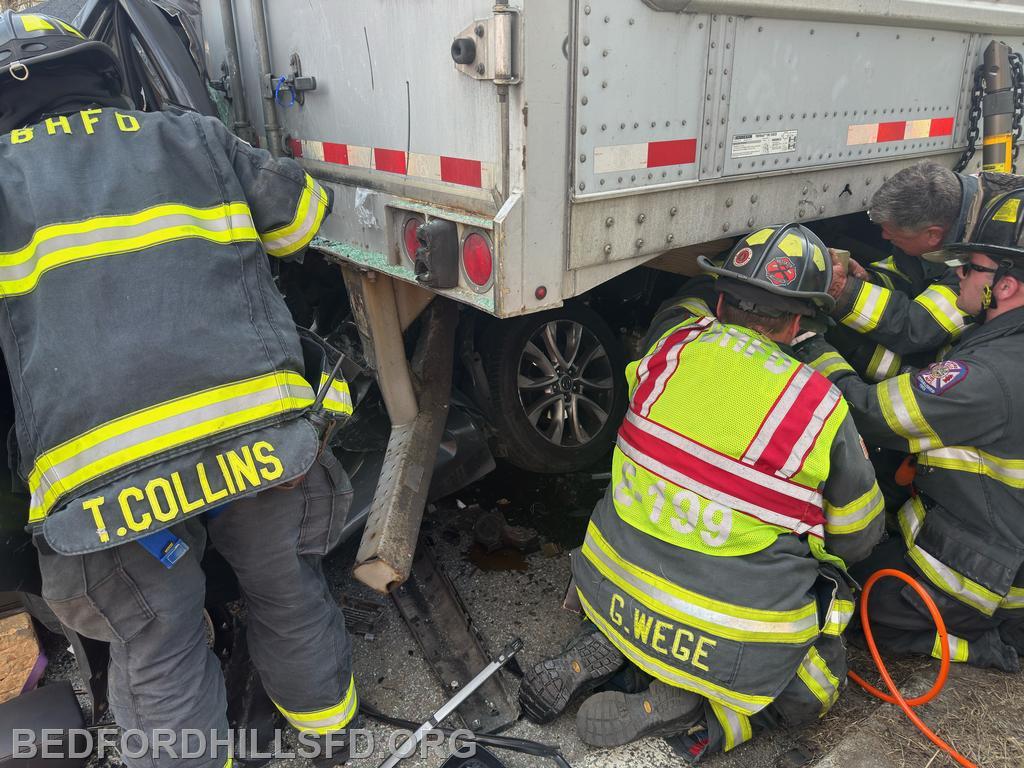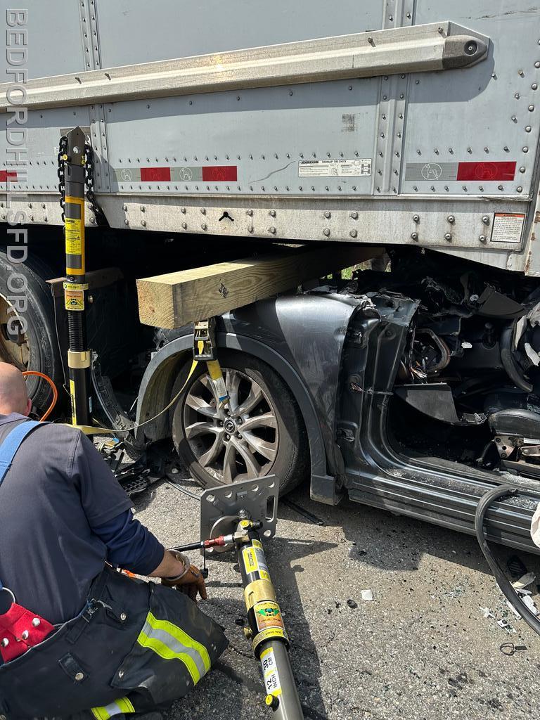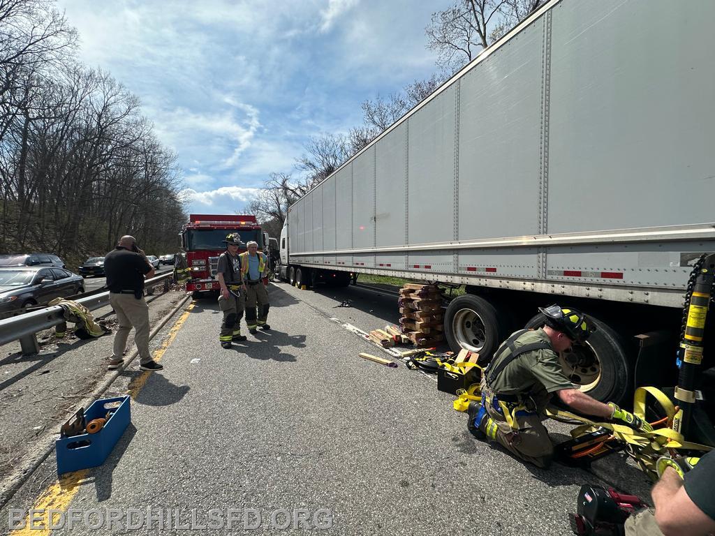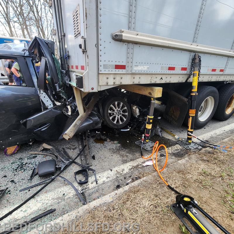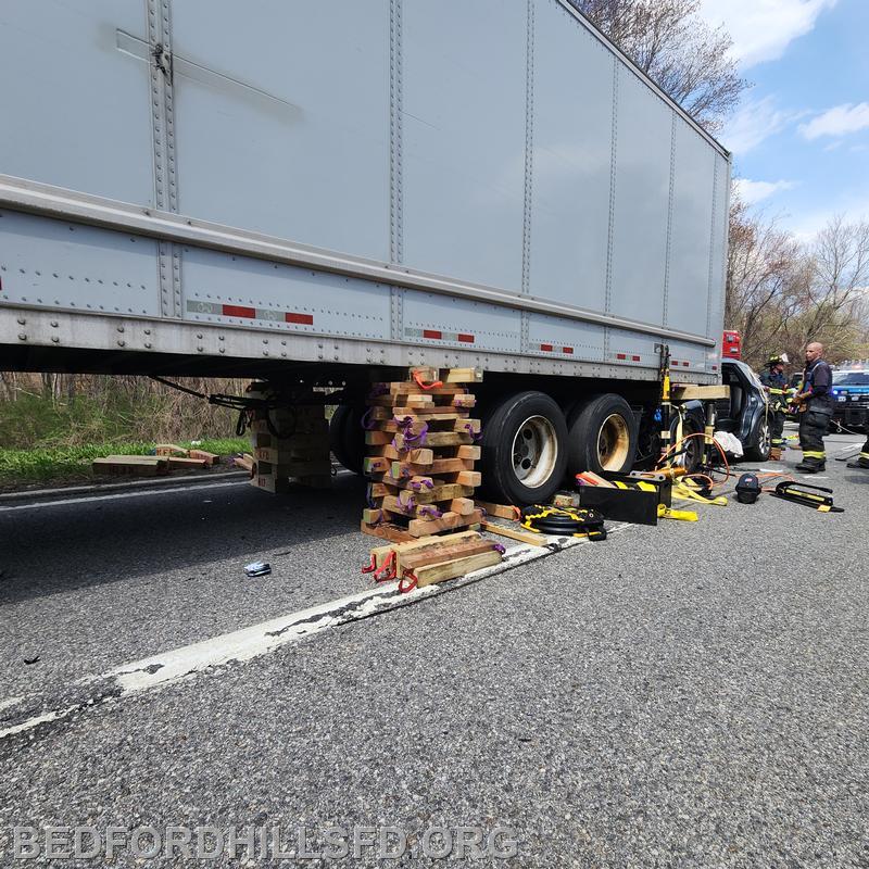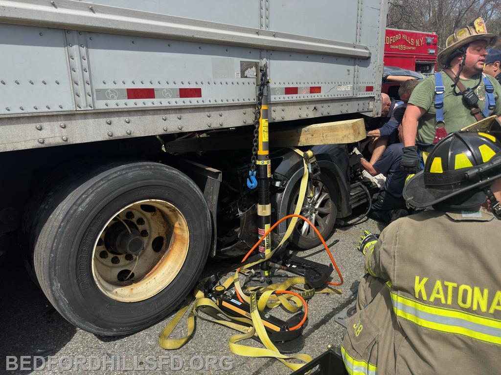 At approximately 1:47pm. on Tuesday, April 14, 2026, the Bedford Hills Fire Department was dispatched to a reported motor vehicle accident with entrapment on the Saw Mill River Parkway. Chief Patierno (Car 2031) arrived first on scene and determined the crash had occurred within the Katonah Fire District, between the Route 117 Bypass exit and the Harris Road exit. Chief Patierno advised 60 Control that the victim was heavily entrapped after an SUV had underridden a tractor-trailer. He immediately requested mutual aid from the Katonah Fire Department.