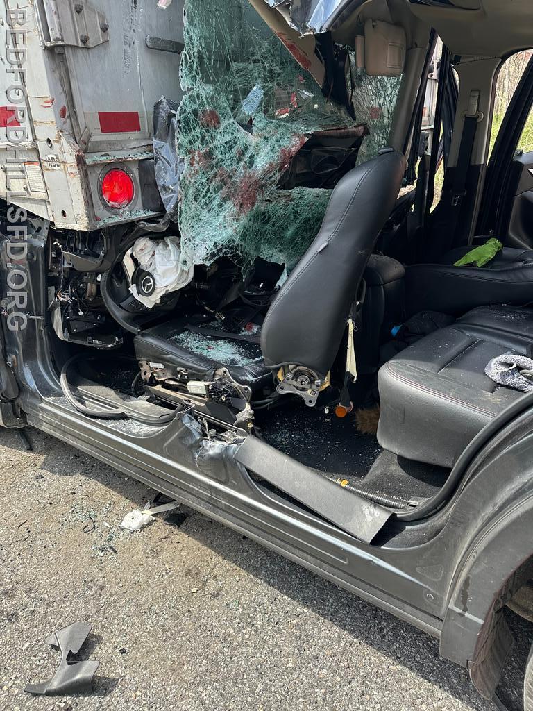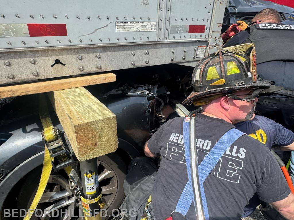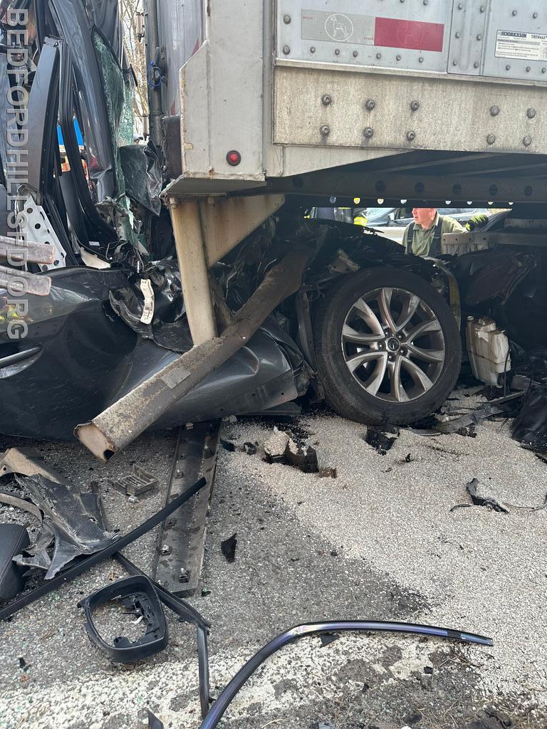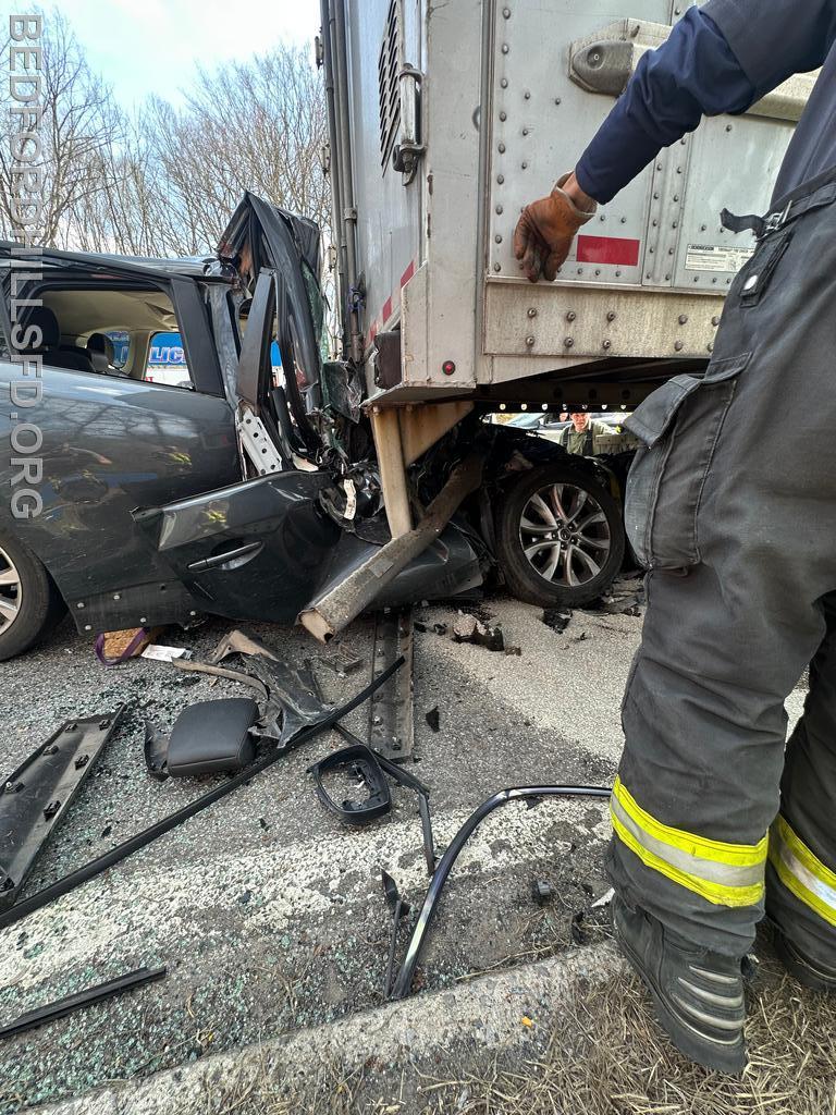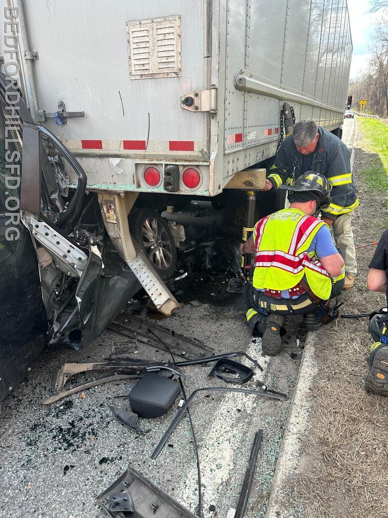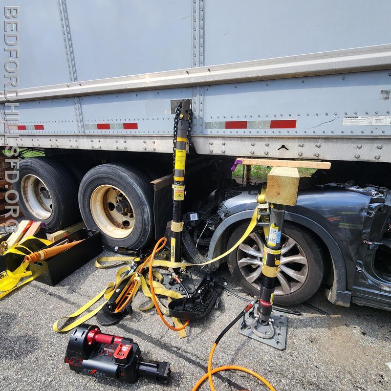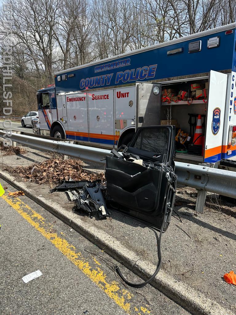 At approximately 1:47pm. on Tuesday, April 14, 2026, the Bedford Hills Fire Department was dispatched to a reported motor vehicle accident with entrapment on the Saw Mill River Parkway. Chief Patierno (Car 2031) arrived first on scene and determined the crash had occurred within the Katonah Fire District, between the Route 117 Bypass exit and the Harris Road exit. Chief Patierno advised 60 Control that the victim was heavily entrapped after an SUV had underridden a tractor-trailer. He immediately requested mutual aid from the Katonah Fire Department.