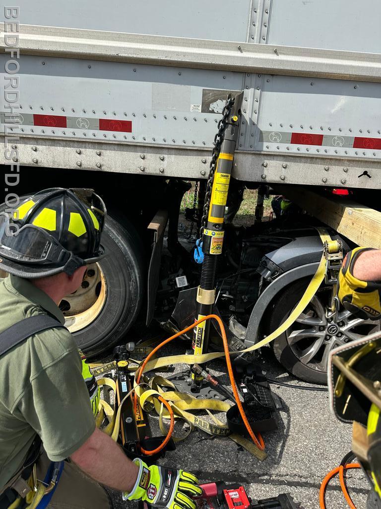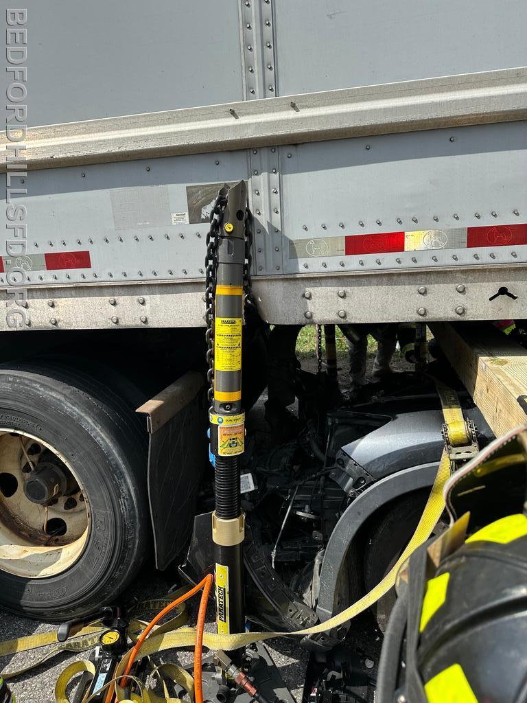 Engine 199 and Rescue 10 responded and initiated an extensive extrication operation. Firefighters deployed specialized equipment, including cribbing, Paratech Hydra-Fusion struts, a grip hoist, and Hurst eDRAULIC tools, to stabilize and lift the tractor-trailer off the SUV.